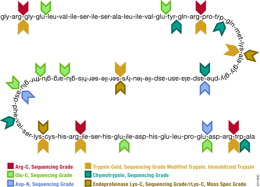 This endoproteinase hydrolyzes peptide bonds on the N-terminal side of aspartic and to a lesser extent glutamic acid residues (Asp and Glu). Asp-N activity is optimal in the pH range of 4.0–9.0. This sequencing grade enzyme can be used alone or in combination with other proteases to produce protein digests for peptide mapping applications or protein identification by peptide mass fingerprinting or MS/MS spectral matching. It is suitable for digestion reactions in solution or in gel.
