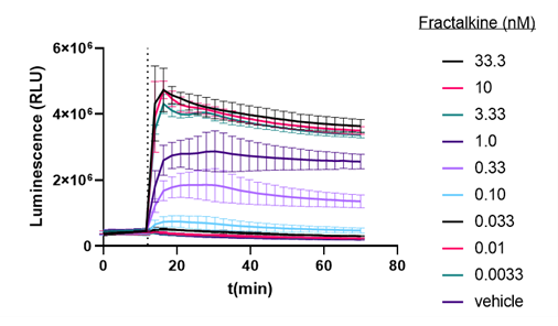 Figure 2: Fractalkine 처리로 시간이 지남에 따라 NanoBiT® signal이 증가합니다.