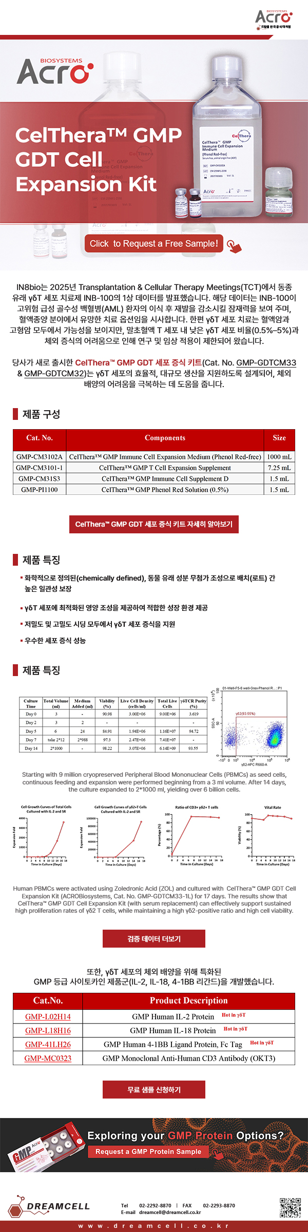 ACROBIO가 새로 출시한 CelThera™ GMP GDT 세포 증식 키트(Cat. No. GMP-GDTCM33 & GMP-GDTCM32)는 γδT 세포의 효율적, 대규모 생산을 지원하도록 설계되어, 체외 배양의 어려움을 극복하는 데 도움을 줍니다.