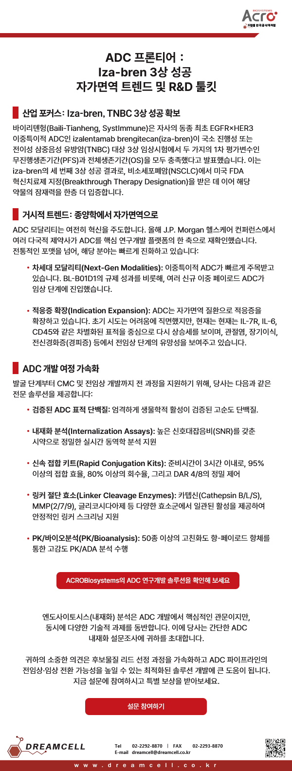 드림셀은 ACROBiosystems의 한국 공식 대리점으로서, 빠르게 진화하는 ADC 개발 여정의 전 과정을 지원하는 전문 솔루션을 공급하고 있습니다
