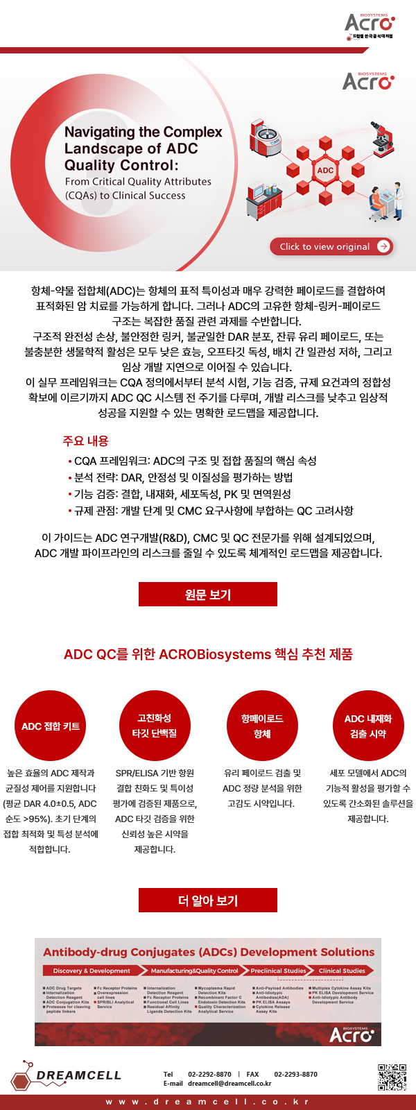 항체-약물 접합체(ADC) 개발의 복잡한 품질 과제를 해결하세요. 드림셀이 제안하는 ACROBiosystems의 ADC QC 로드맵과 고성능 분석 솔루션을 소개합니다.