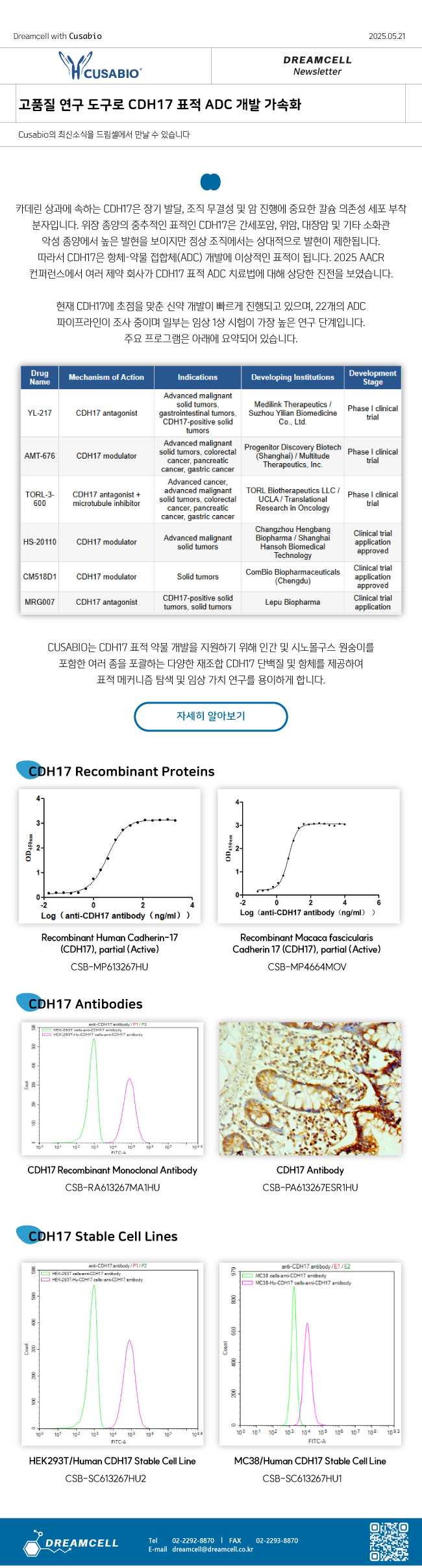 드림셀에서 CUSABIO의 CDH17 표적 약물 개발 연구를 소개합니다.