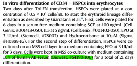 연구진은 교정된 조혈모세포가 실제로 기능적인 적혈구로 성장할 수 있는지 확인하기 위해 체외 적혈구 분화(In vitro erythroid differentiation) 실험을 진행했으며, 이 과정에서 Biowest 사의 Human AB Serum (S4190)을 사용했습니다.