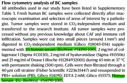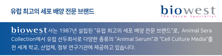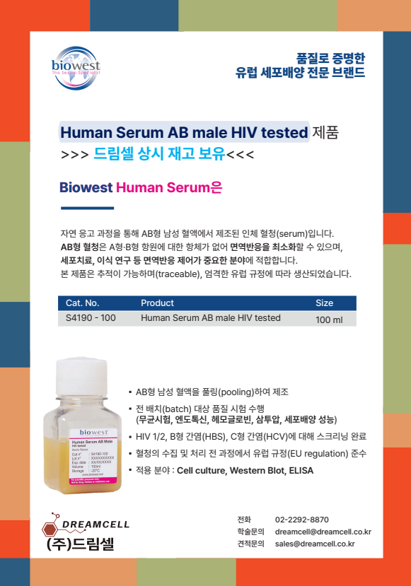 연구진은 환자의 실제 종양 조직에서 세포를 분리하고 분석하는 과정 전반에서 Biowest 사의 Human AB Serum (S4190)을 필수적으로 사용했습니다. 이 논문에서 S4190은 단순한 영양 공급원을 넘어, 임상 시료의 고유한 표현형을 유지하면서 단일 세포 단위로 추출하고, 이를 고해상도로 분석(Flow Cytometry)하기 위한 핵심 시약으로 기능했습니다. 특히 환자 유래의 일차 세포(Primary cells)를 다루는 실험 특성상, 인체 환경과 가장 유사한 품질의 인간 혈청을 사용한 것이 데이터의 신뢰성을 확보하는데 기여했습니다.