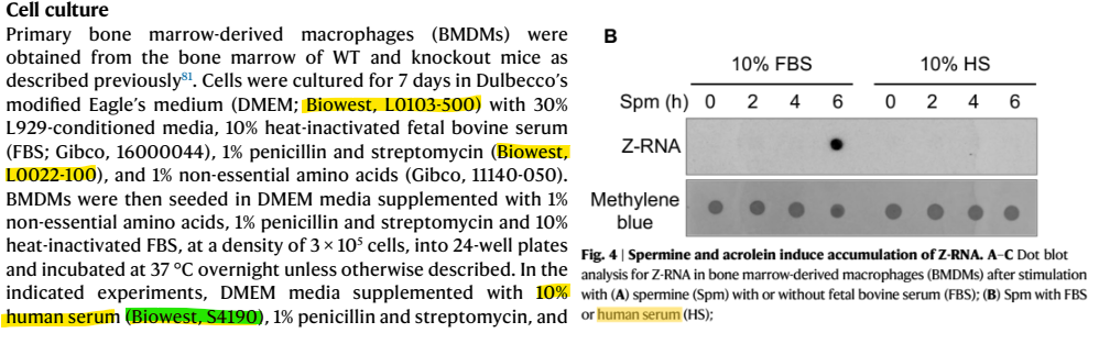 연구진은 폴리아민에 의한 세포 사멸이 혈청 내 효소에 의해 생성된 아크롤레인 때문임을 증명하기 위해 Biowest 사의 Human AB Serum (S4190)을 실험에 사용했습니다.