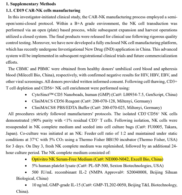 본 연구에서는 CD19 CAR-NK 세포 치료제의 제조 과정에서 NK 세포의 활성화 및 증식을 위해 Optivitro NK Serum-Free Medium (Cat#: NE000-N042, Excell Bio, China)을 사용.