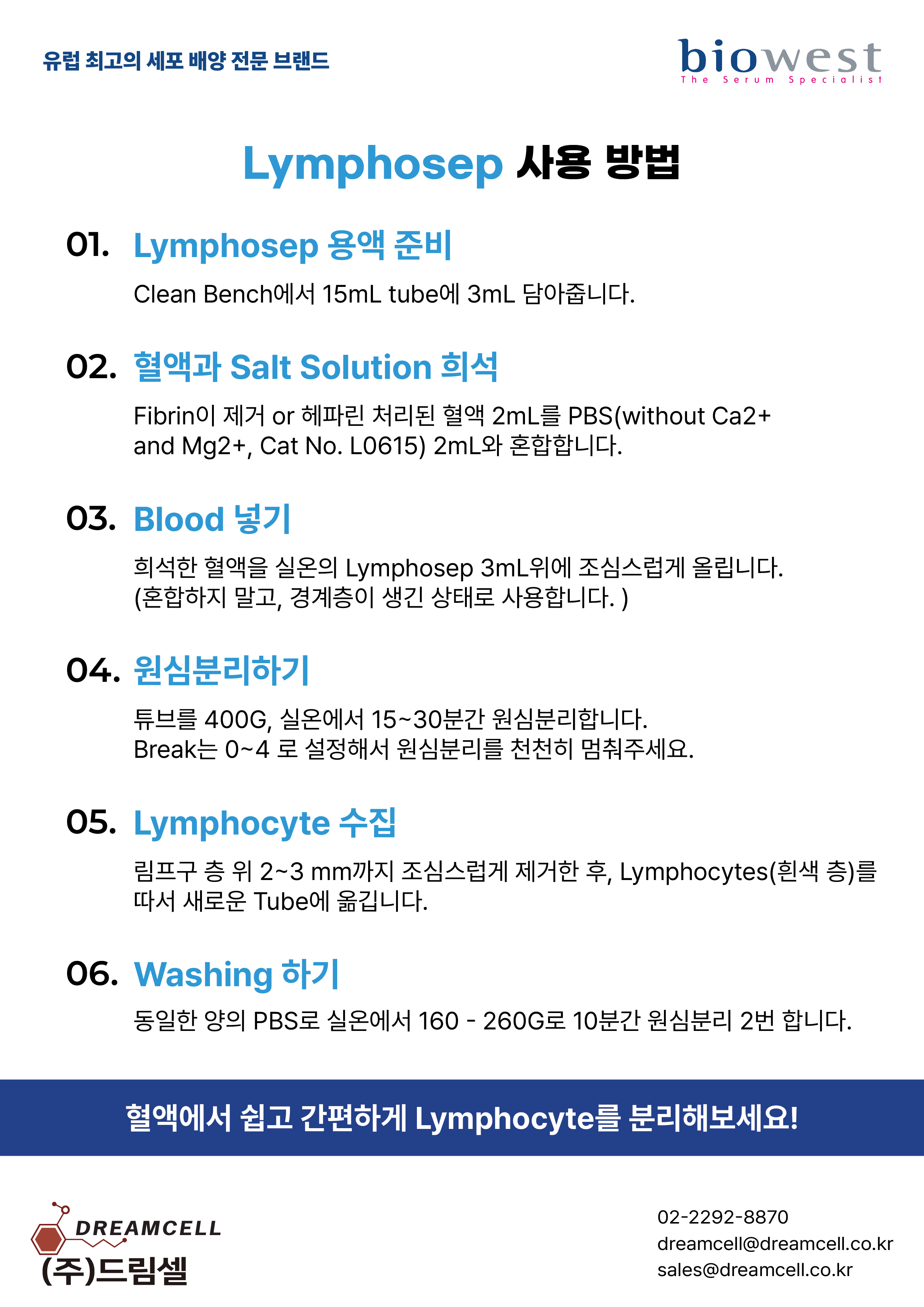 드림셀이 제안하는 Biowest Lymphosep 파격 할인 이벤트! 기존 Ficoll 대체 가능한 고품질 림프구 분리 시약(500mL x 6병)을 70만 원 특가에 만나보세요. 2026년 4월까지 한정 진행됩니다.