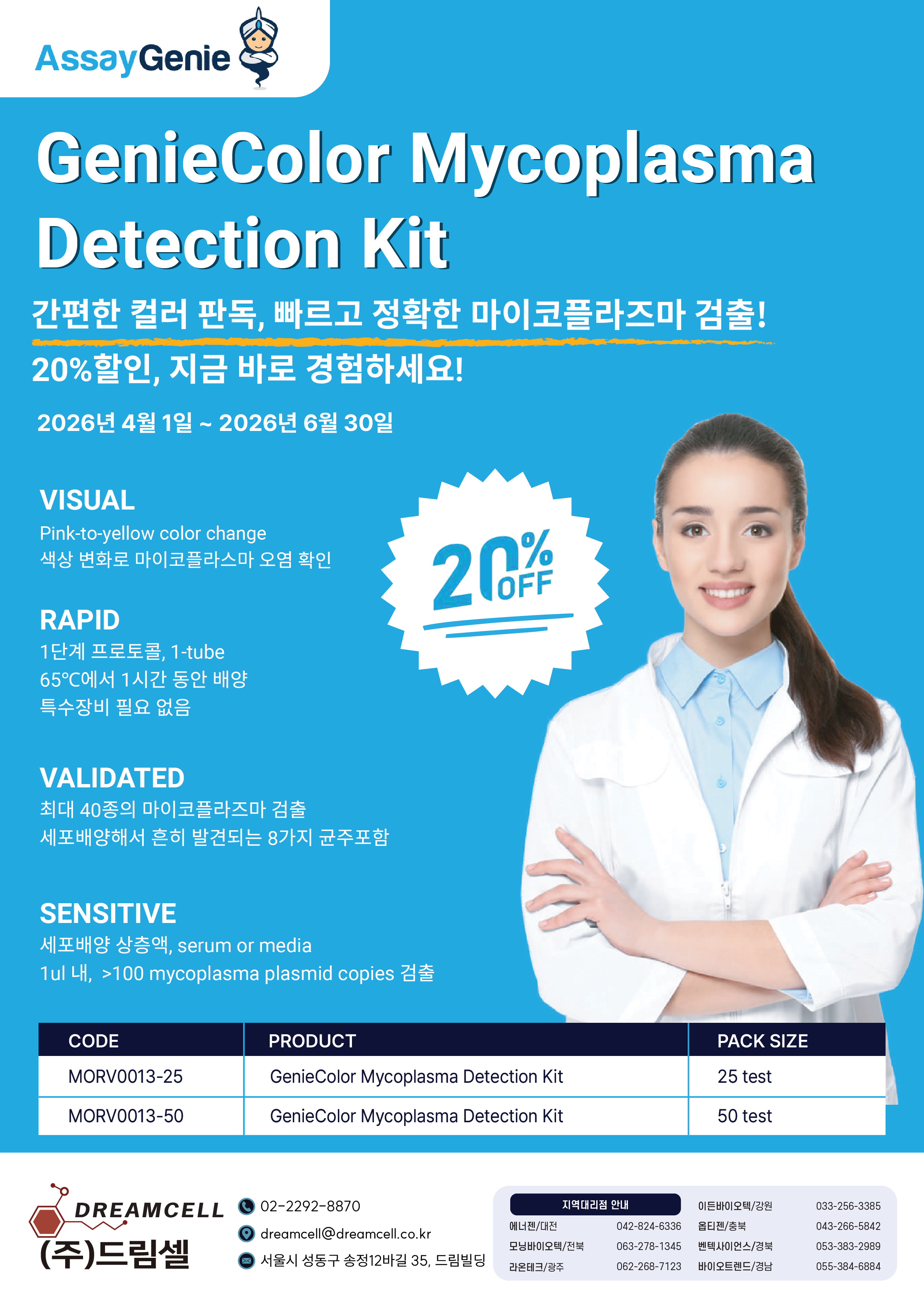 세포 배양의 적, 마이코플라즈마 오염을 신속하게 검출하세요. 드림셀이 제안하는 Assay Genie GenieColor Kit 20% 할인 프로모션! 특허받은 컬러 판독 기술로 빠르고 정확한 결과를 보장합니다.