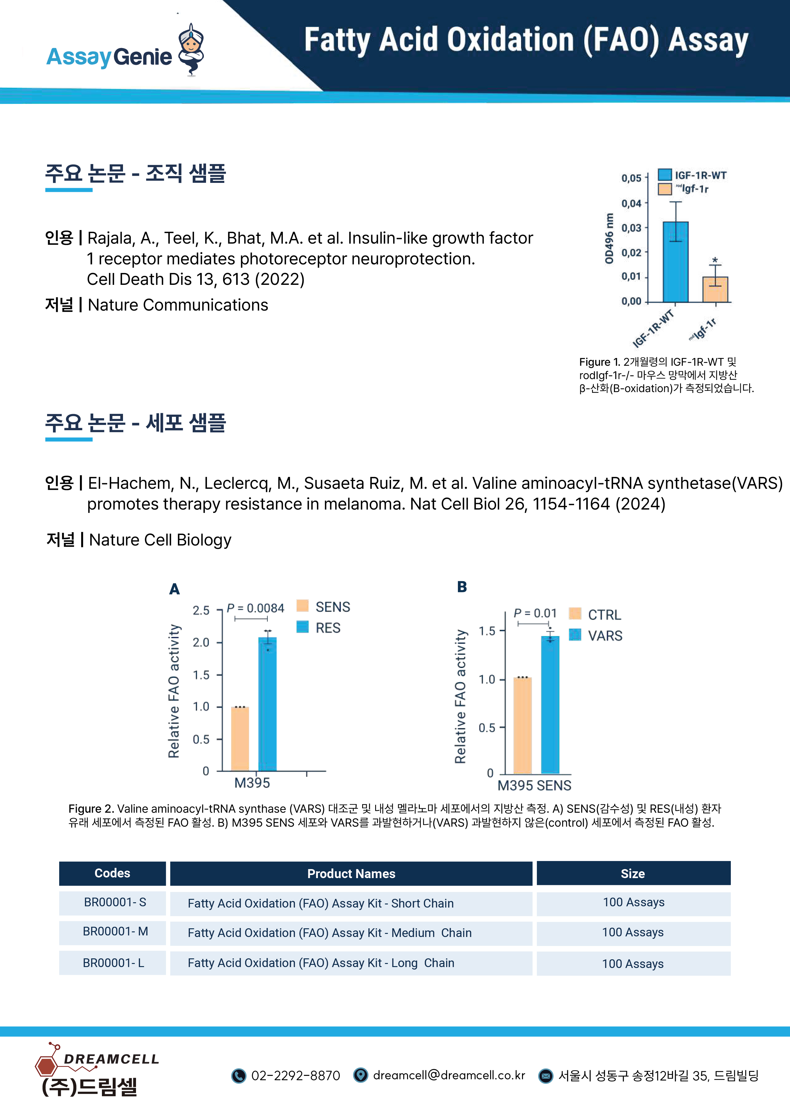 드림셀이 제안하는 Assay Genie Fatty Acid Oxidation (FAO) Assay Kit 20% 할인! 세포와 조직의 지방산 β-산화를 고감도로 정량 측정하세요. 간편한 프로토콜과 검증된 성능으로 연구를 가속화합니다.