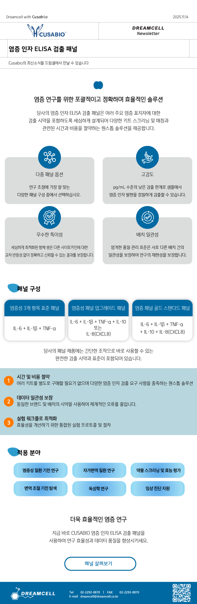 CUSABIO에서 염증 연구를 위한 염증 인자 ELISA 검출 패널을 선보입니다. 이 패널은 여러 핵심 염증 마커를 동시에 측정할 수 있도록 설계된 원스톱 솔루션으로, 연구 시간과 비용을 획기적으로 절약해 줍니다. 연구 목적에 따라 표준, 업그레이드, 골드 표준 등 다양한 구성 옵션(예: IL-6, IL-1beta, TNF-alpha, IL-10, IL-8 등)을 선택할 수 있습니다. 특히, pg/mL 수준의 초고감도와 다른 사이토카인과의 반응이 없는 뛰어난 특이성을 갖추고 있어 정밀하고 신뢰도 높은 데이터를 보장합니다. 또한, 엄격한 품질 관리를 통해 배치 간 일관성을 확보하여 연구의 재현성을 높였습니다. 이 패널은 염증성 및 자가면역 질환 연구, 약물 스크리닝 및 효능 평가, 독성학 연구 등 광범위한 분야에 적용 가능합니다. CUSABIO 염증 인자 ELISA 검출 패널을 통해 효율적인 실험 워크플로우를 구축하고 데이터 품질을 향상시키세요!