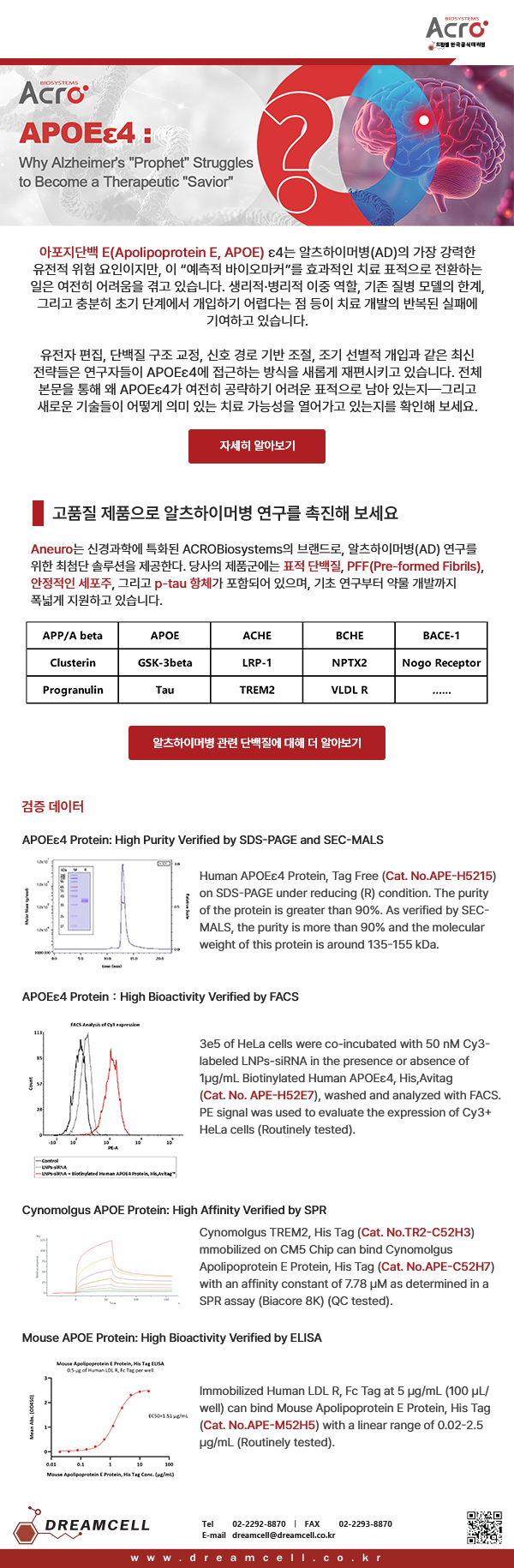 안녕하세요 ACROBiosystems 공식대리점 드림셀입니다. APOE ε4는 알츠하이머병(AD) 연구의 핵심 유전적 위험 인자입니다. ACROBiosystems의 고순도 APOE ε4 단백질 및 AD 관련 제품으로 혁신적인 치료제 개발을 시작하세요.