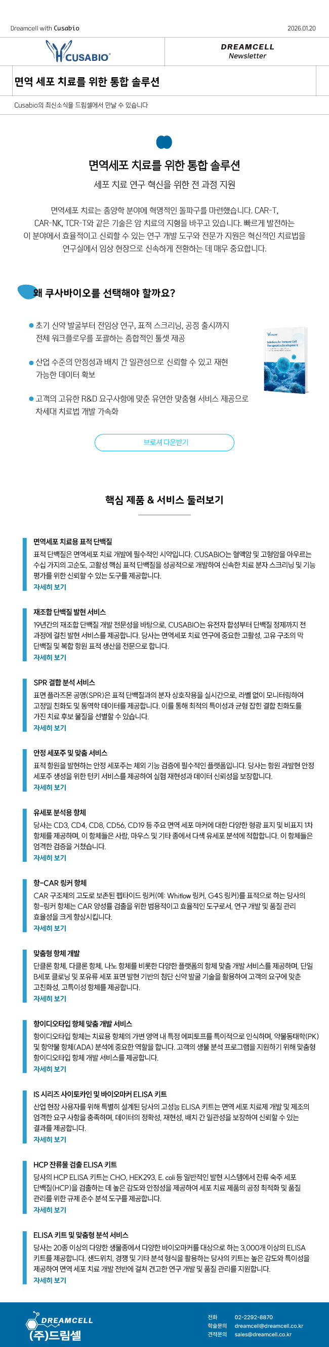 CAR-T, CAR-NK 등 차세대 면역 세포 치료 연구를 위한 CUSABIO의 전 과정 지원 서비스를 소개합니다. 표적 발굴부터 공정 품질 관리까지 드림셀이 함께합니다.