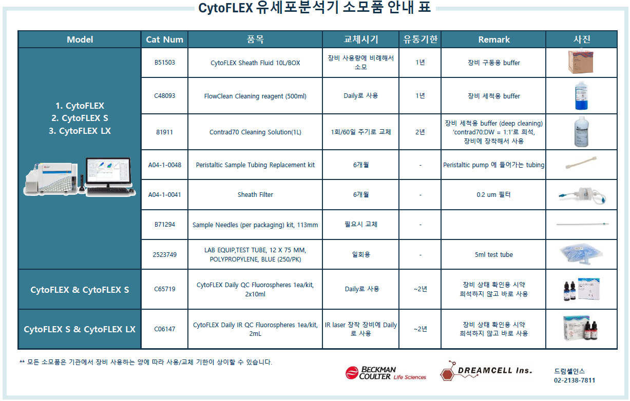 CytoFLEX 유세포 분석기 소모품 안내표