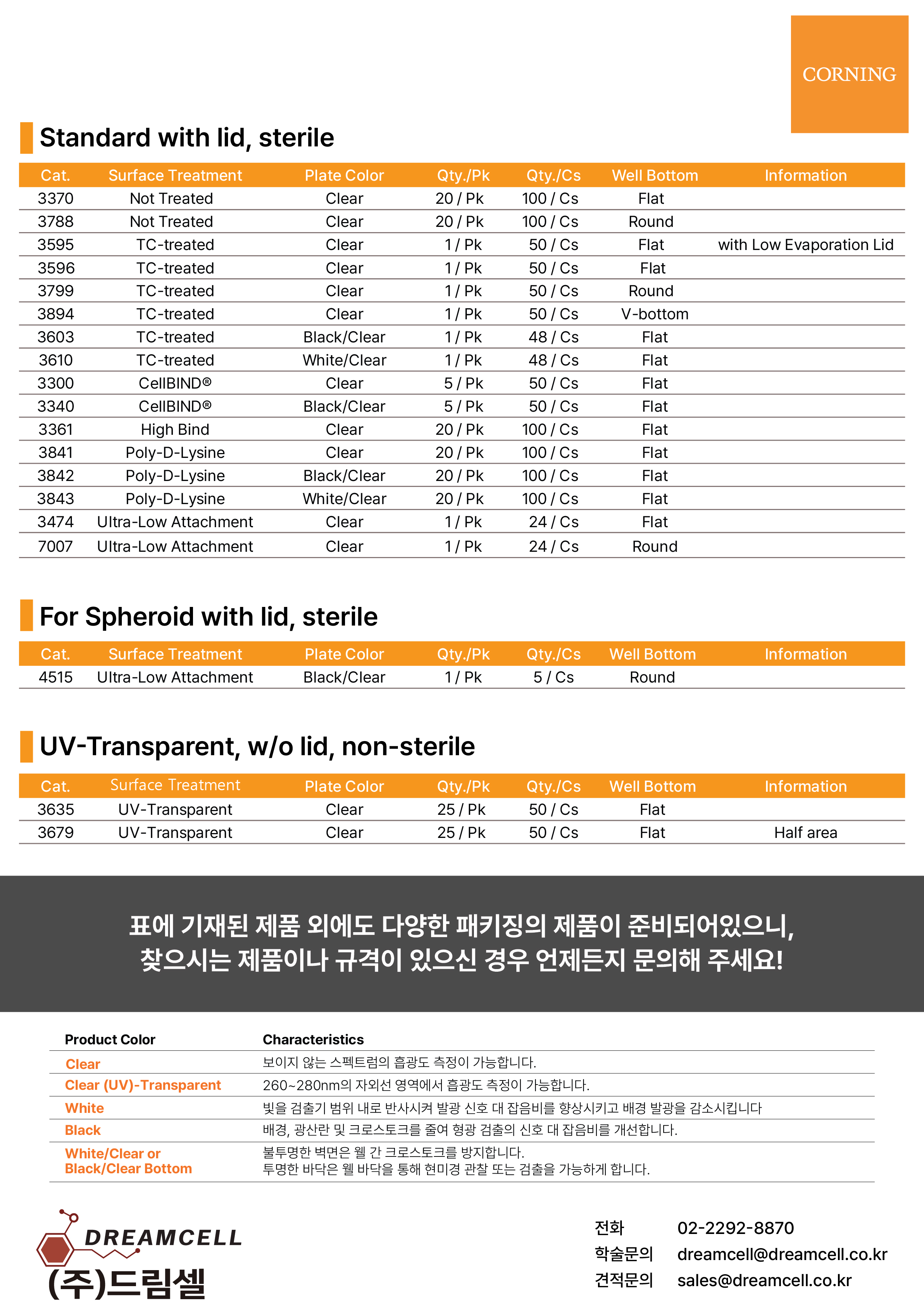 드림셀이 준비한 코닝 96-well plate 특별 프로모션! Clear, Black, White 전 제품 20% 할인에 3박스 이상 구매 시 추가 10% 혜택까지 제공합니다. (2026.01.20~02.28)